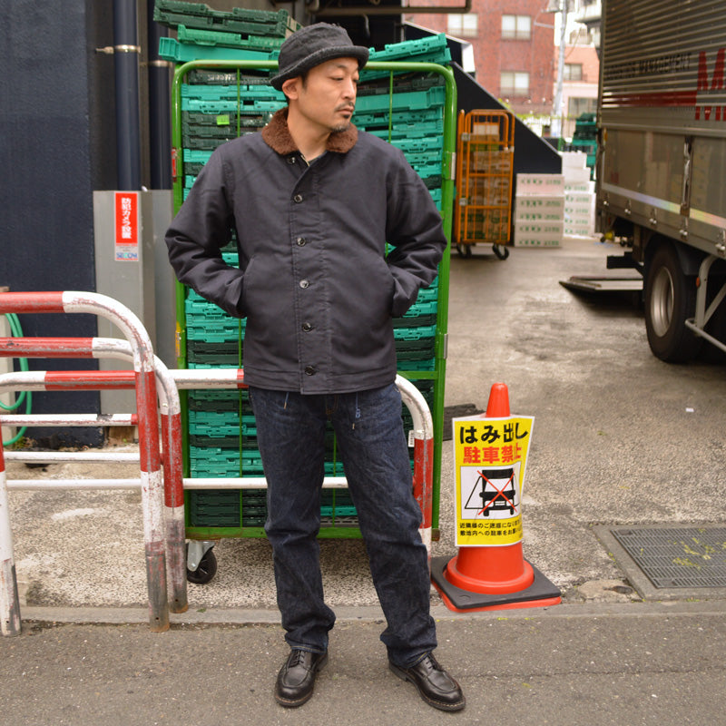 Like other deck jackets, the outer material is cotton grosgrain, commonly known as jungle cloth, while the lining is made of alpaca mohair and wool pile, which provides excellent wind resistance and warmth.