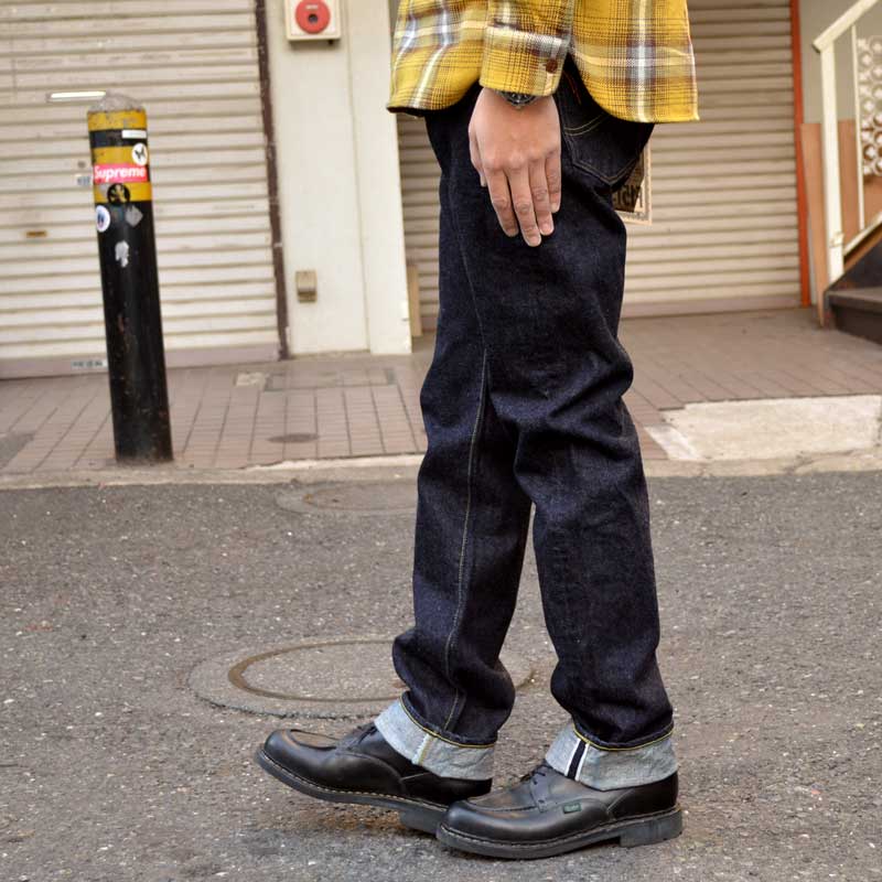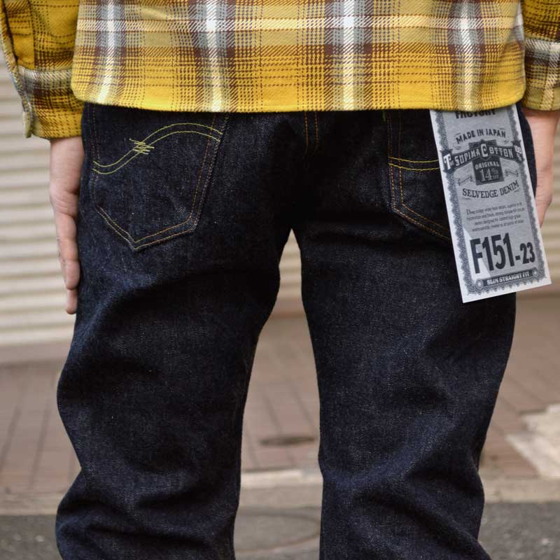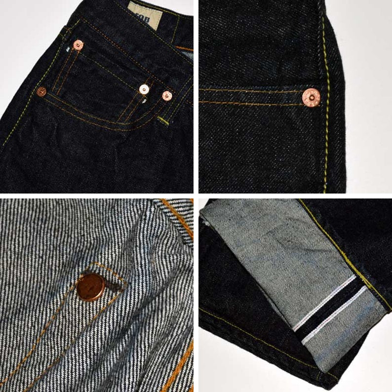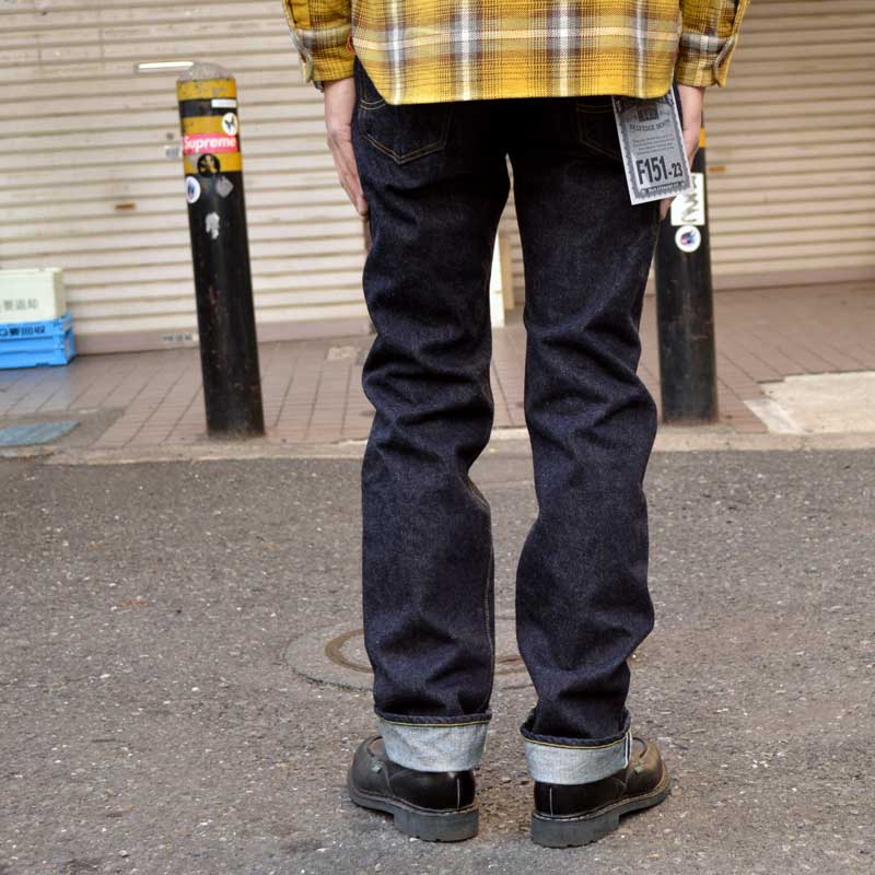 ・Part number F151-23 ・100% cotton ・Made in Japan ・Details: leather patch, copper rivets, button fly, cotton thread sewing, selvedge, green tab, hidden rivets