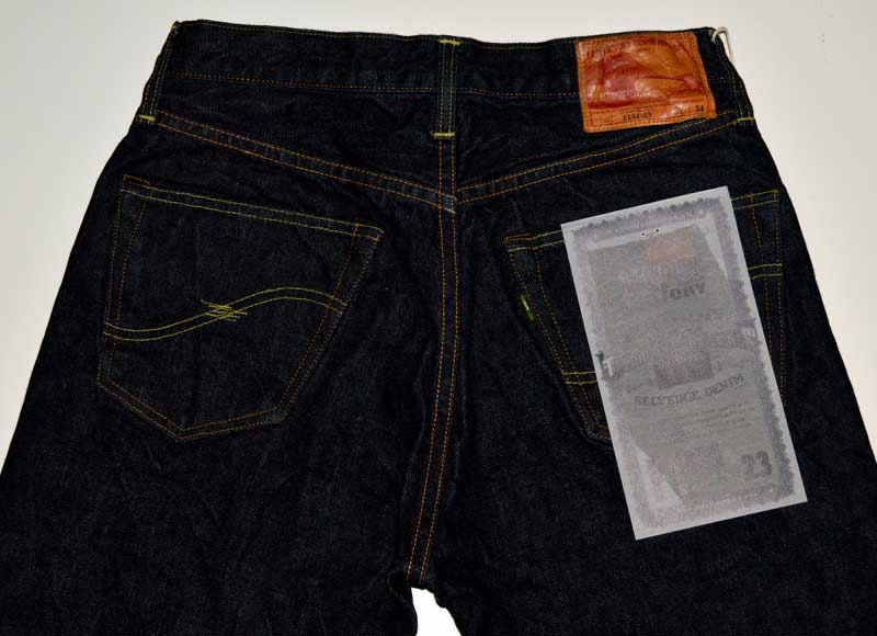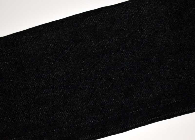 The fabric uses a thick selvage of 14,5 oz made with an old-fashioned loom. Rope dyeing is repeated to make extremely dark denim.