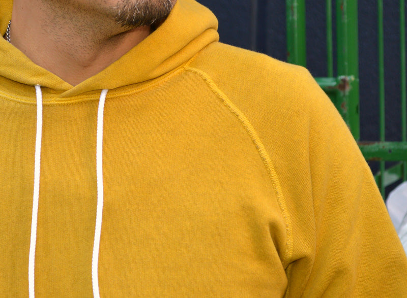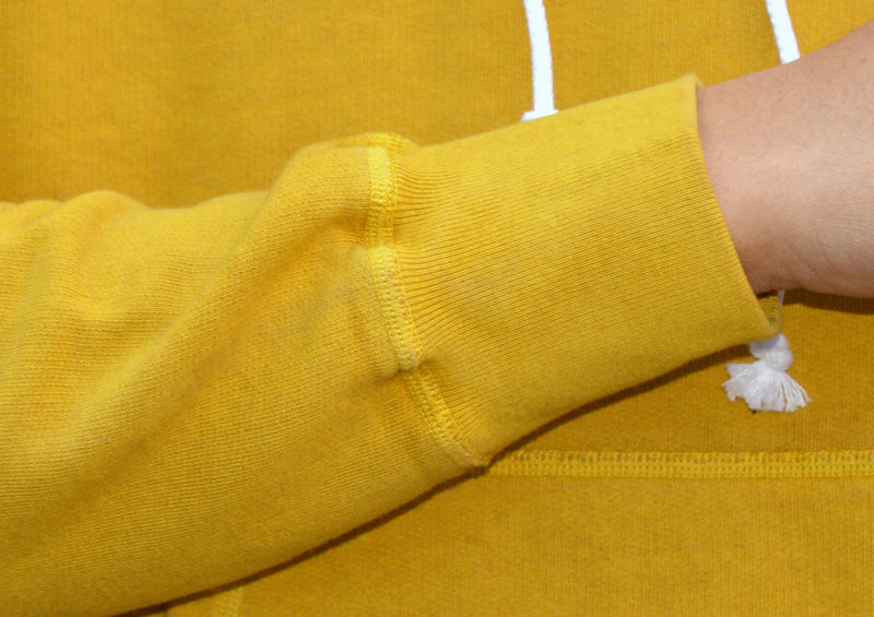 The slightly larger kangaroo pocket features a playful and rounded design. The top and bottom of the pockets are left cut-off and sewn using a three-needle sewing machine, creating a rough and tasteful design that resembles old clothing.
