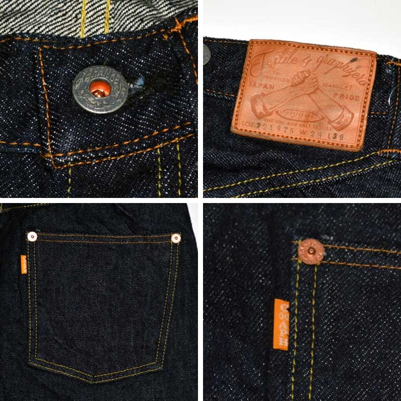 The orange selvedge with two lines is proof of graphzero. The gray denim has a rough and fuzzy feel, so it conforms to your body every time you wear it, and graphzero's right twill allows you to enjoy the typical vintage spotting, and depending on the spot, vertical spots may appear.