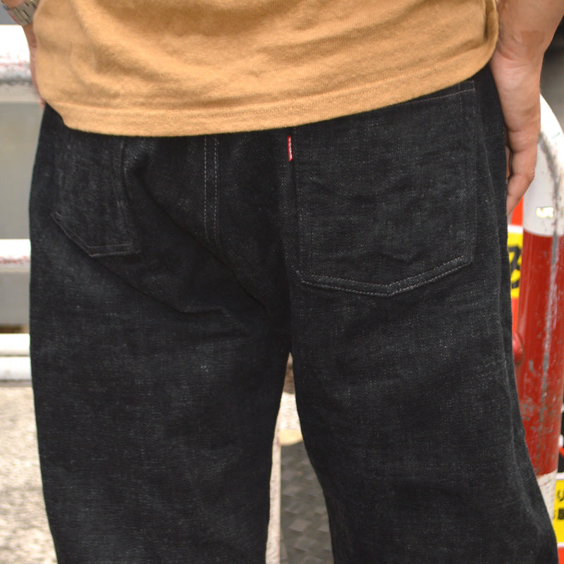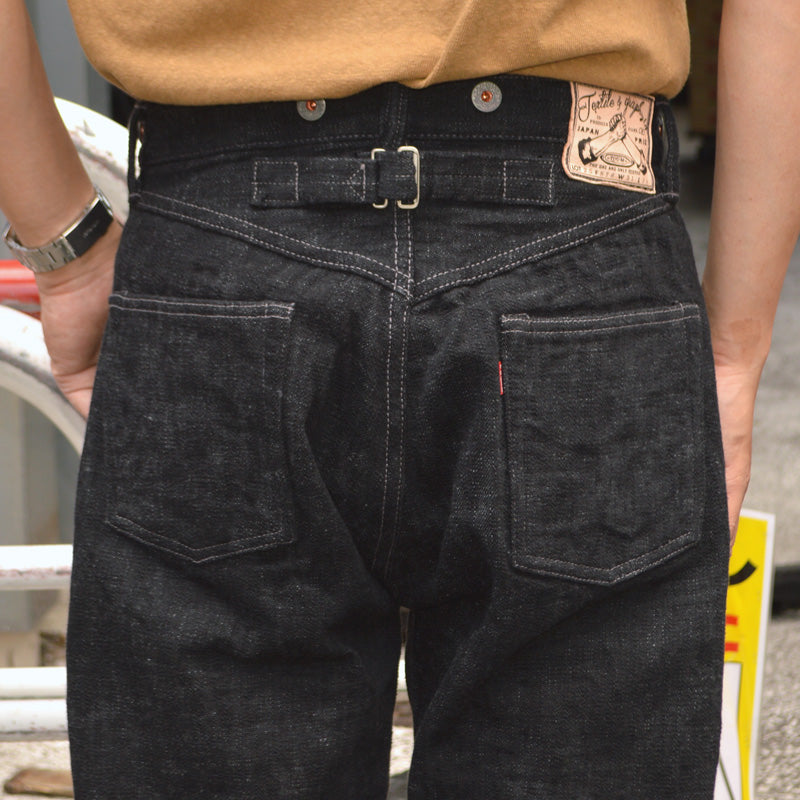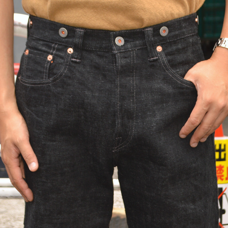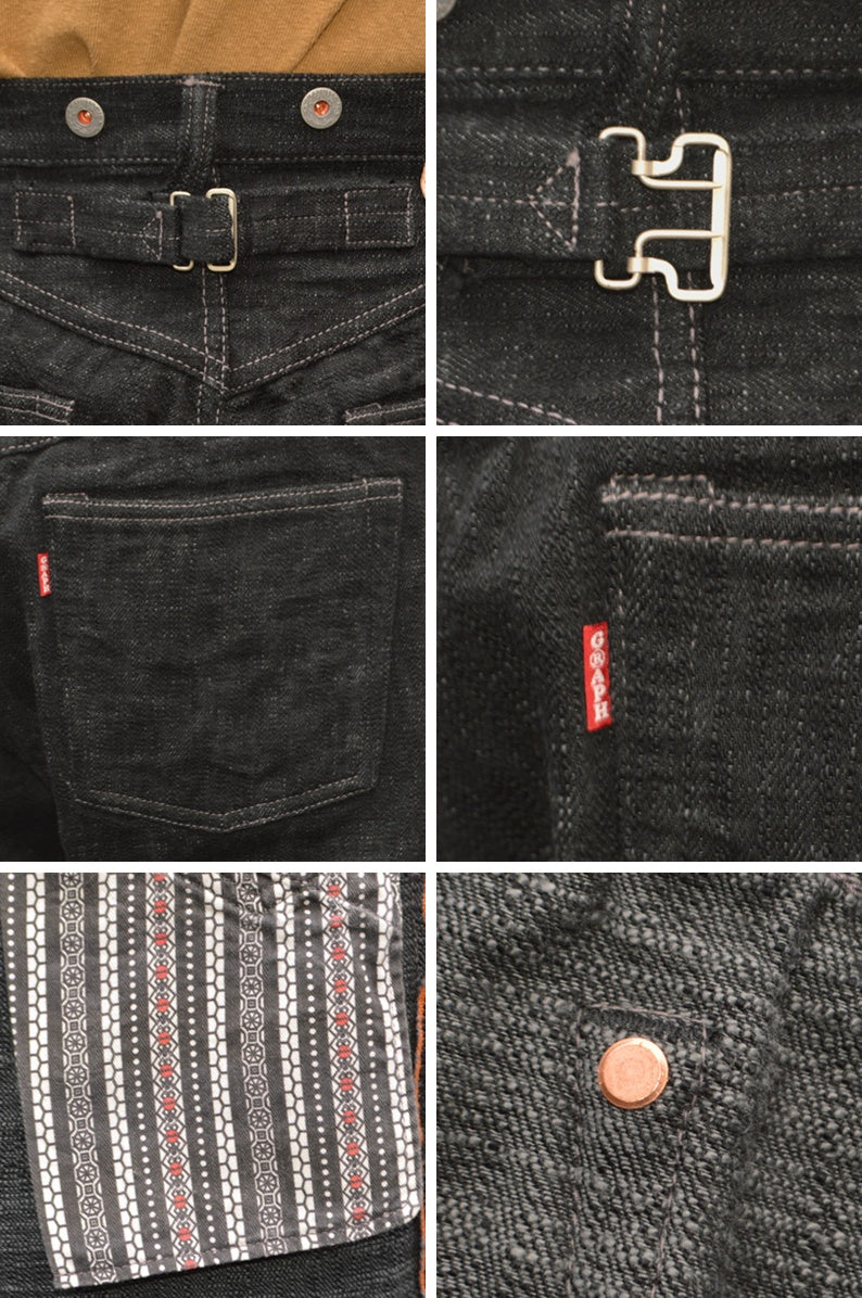 Product number: GZ-HRJSK-BK; 100% cotton ; Made in Japan; Details: Tanned leather patch, copper rivets, button fly, iron buttons, cotton thread stitching, selvedge , hidden rivets, red piss