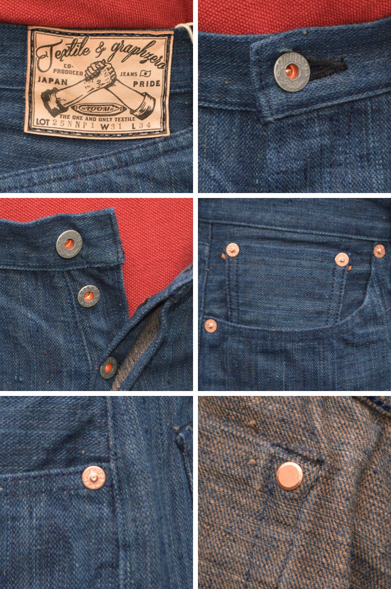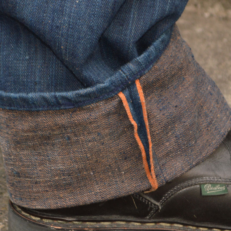 Product number: GZ-NPST; 100% cotton; Made in Japan; Details: Tanned leather patch, copper rivets, button fly, iron buttons, cotton thread stitching, selvedge (orange), hidden rivets, orange piss