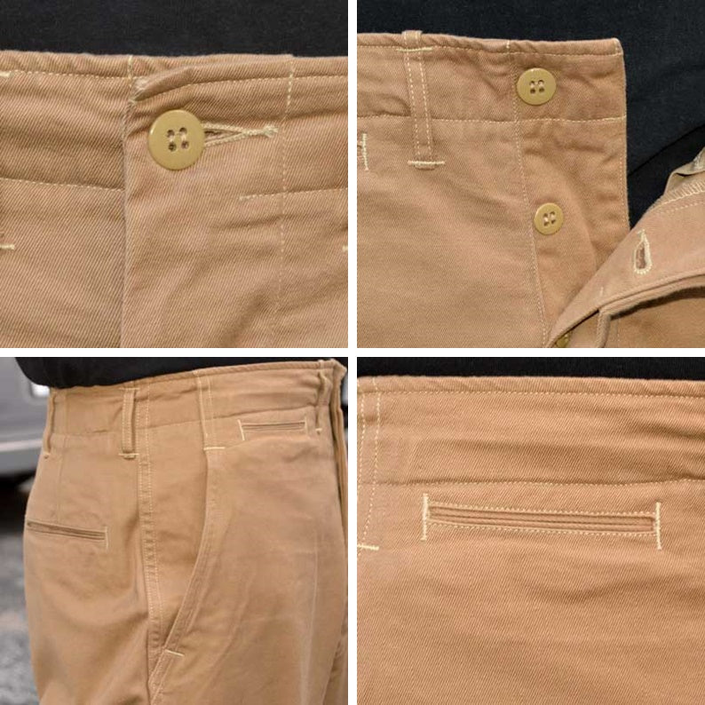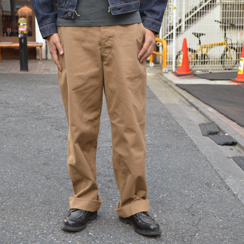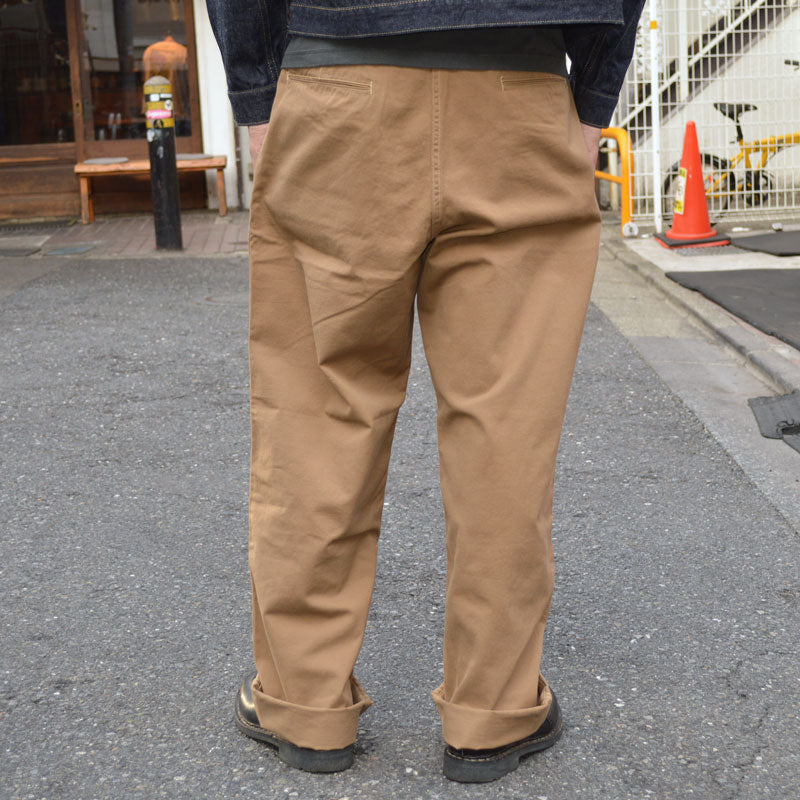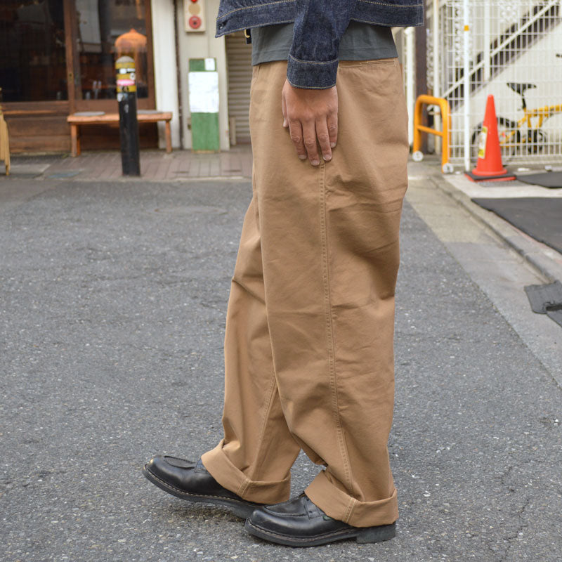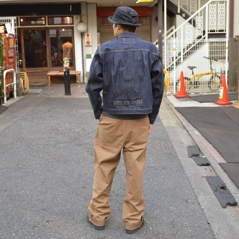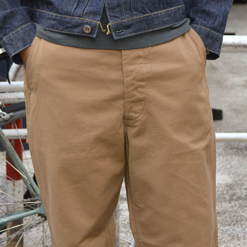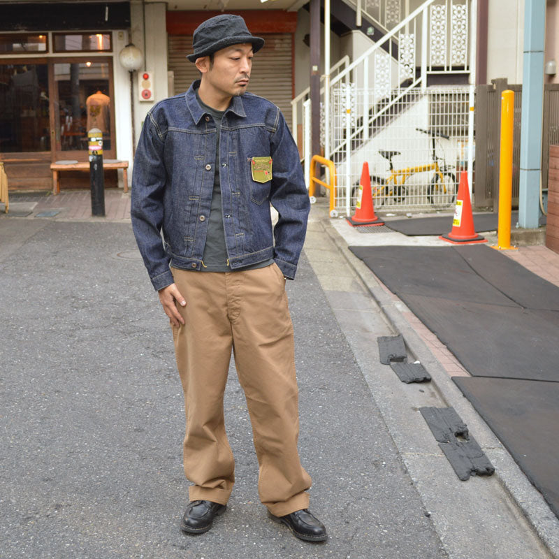 Normally, the pockets are made of sleek, but like the vintage sampled, a separate chino fabric is used. The side seam puckering also comes out strongly, adding a rugged look to the thick silhouette when worn.