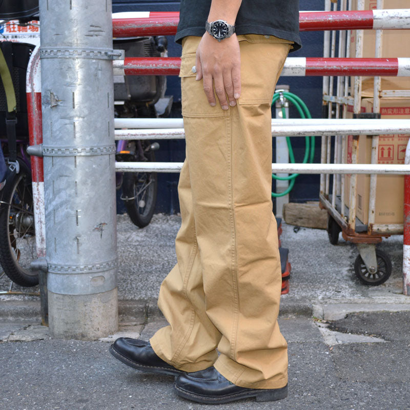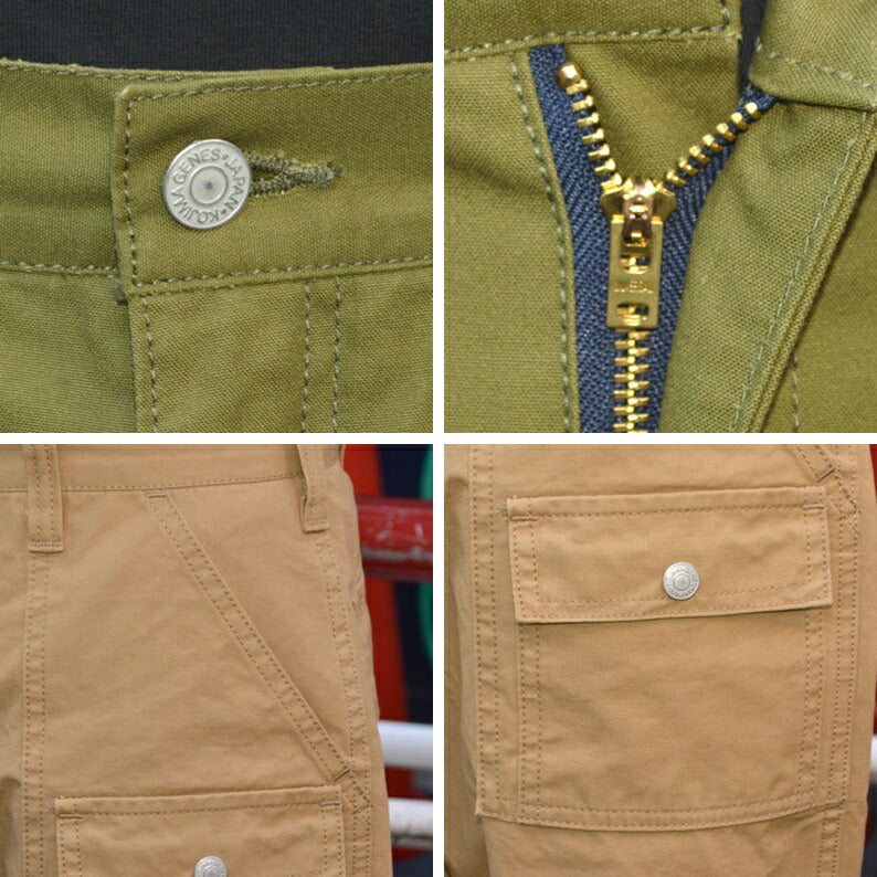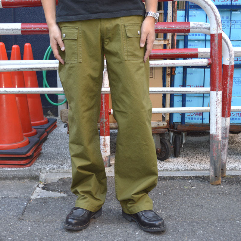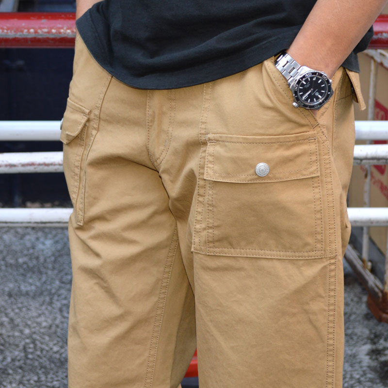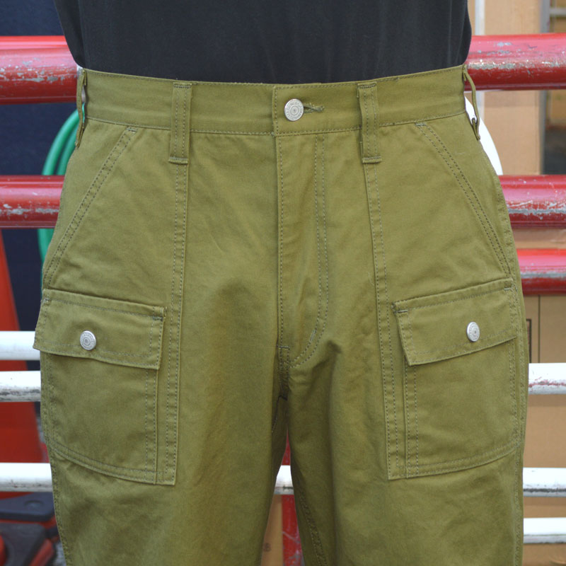 This item is made of fabric with a military feel. Bush pants, which are also a type of work pants, are characterized by their flap pockets on the front.