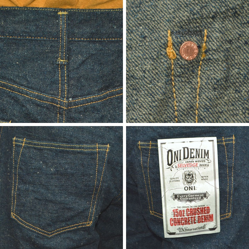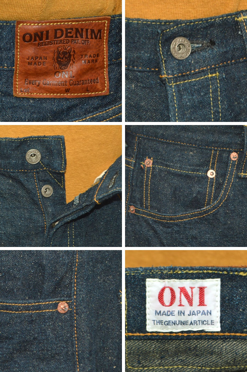 Oni denim's original copper punched rivets. Of course, there is also the familiar detail on the back of the hip pocket, called a hidden rivet.