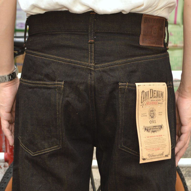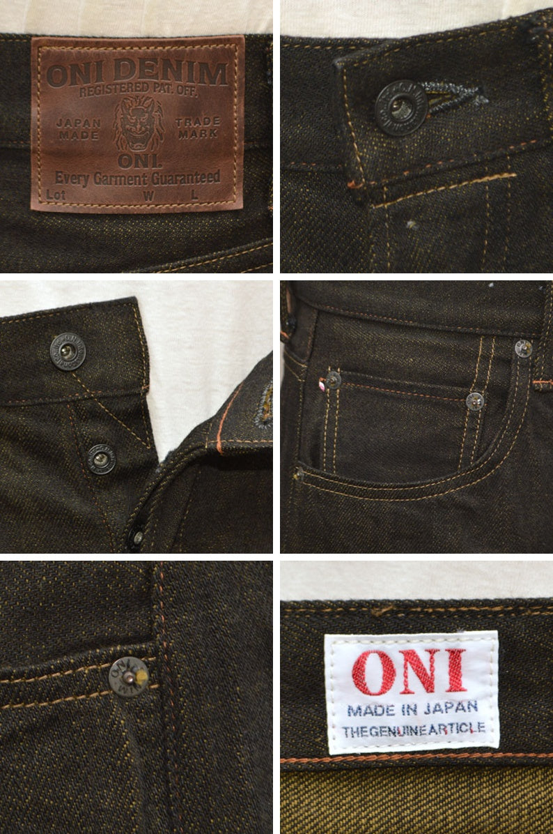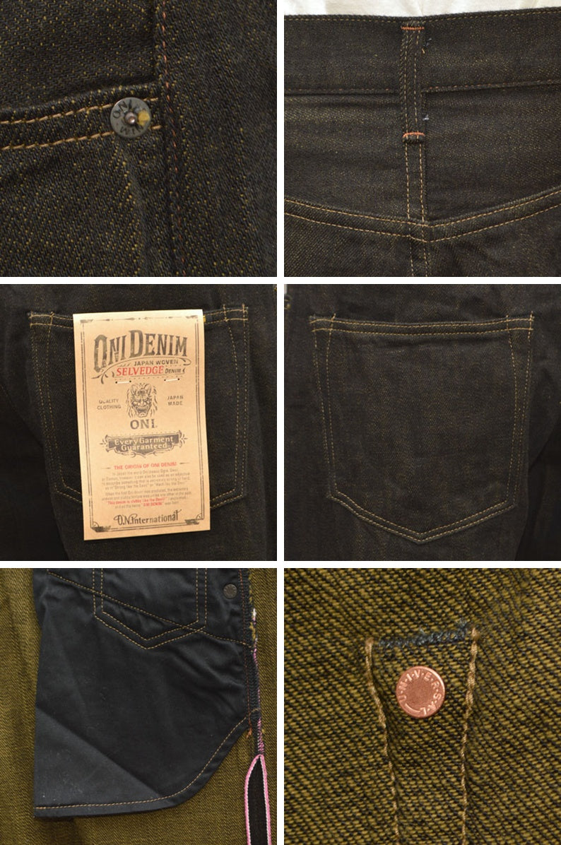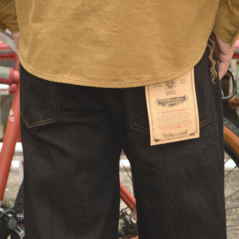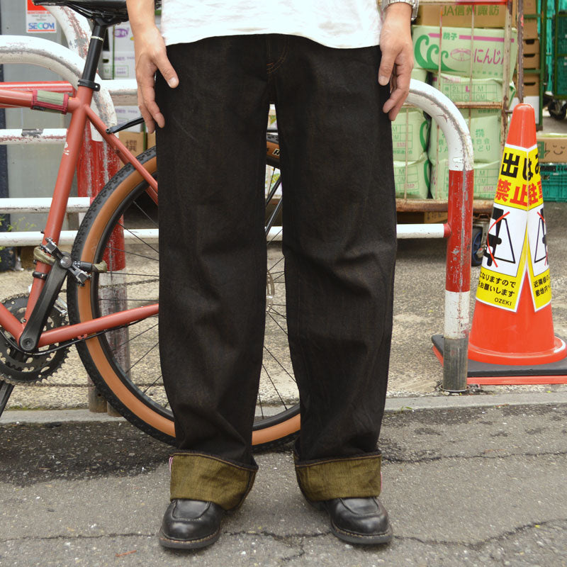 [ONI DENIM "222 BKOL" 12oz Black × Olive Denim Super Wide Straight]