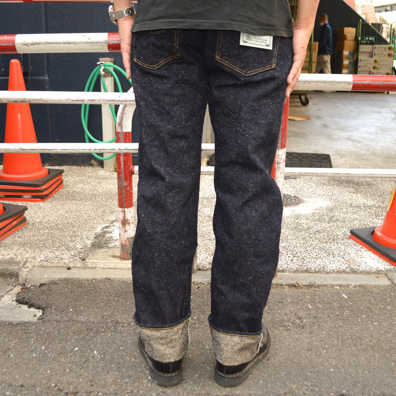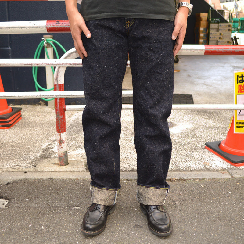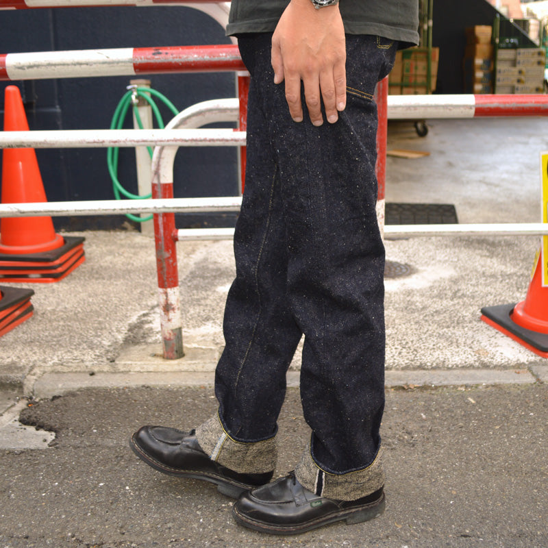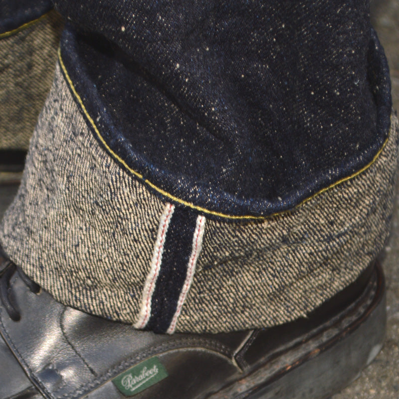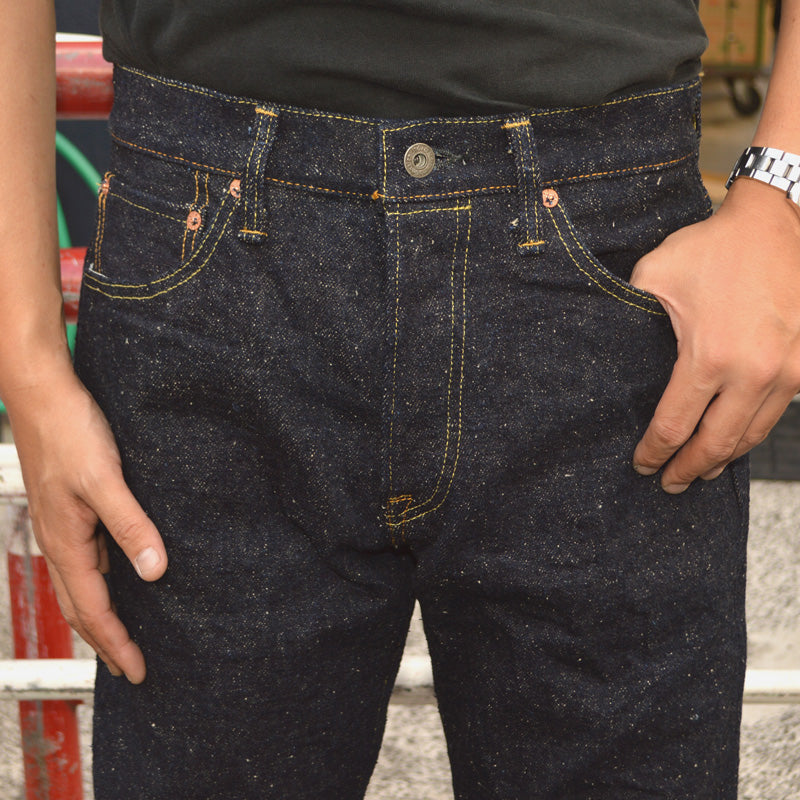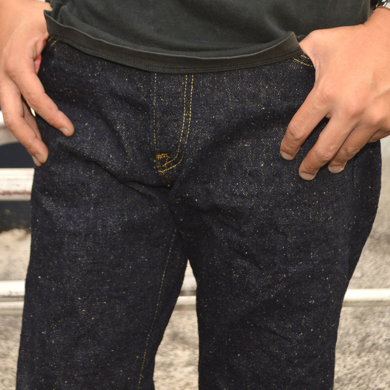 It is made from thick slub nep yarn, resulting in denim with severe unevenness and neps.
