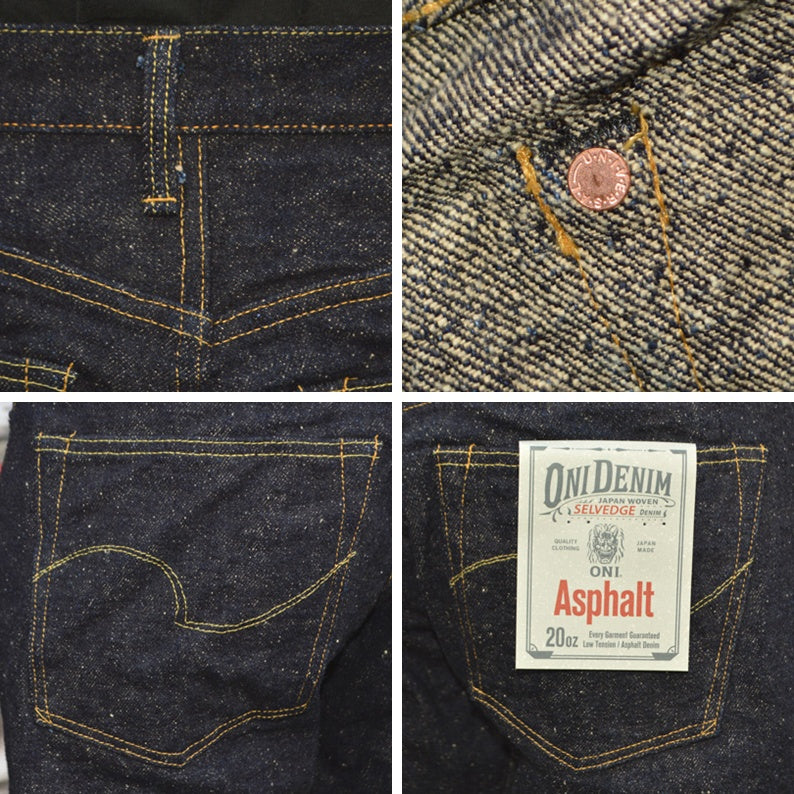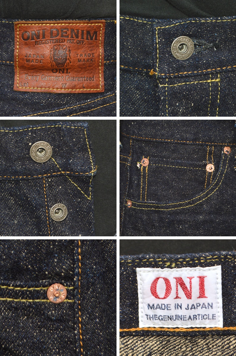 The jeans feature original Oni denim copper punched rivets. Of course, there is also the familiar detail on the back of the hip pocket, known as hidden rivets.