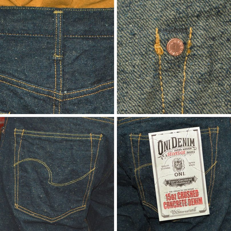 Oni denim's original copper punched rivets. Of course, there is also the familiar detail on the back of the hip pocket, called a hidden rivet.