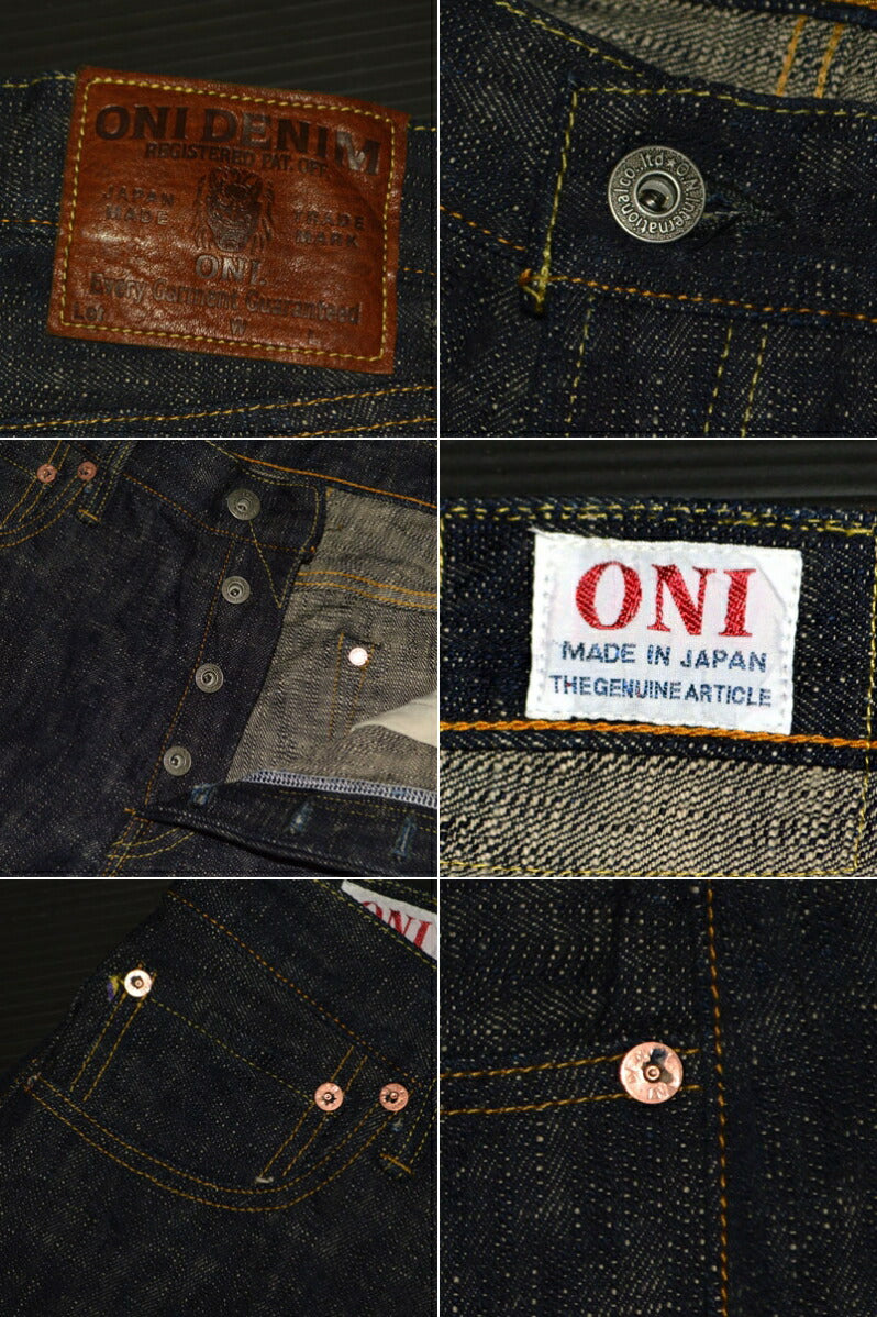 The fabric is 17oz Oni Kasuri denim with a strong rough texture that is characteristic of Oni denim.