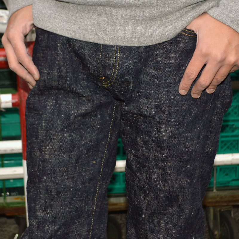 This denim is woven with a mix of extra thick slub yarn and different count yarn, and the mottled pattern gives it a strong impression. The texture of the fabric is truly "oni kasuri".