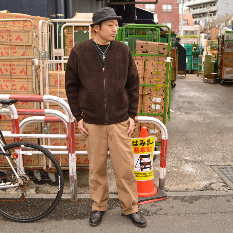 This cardigan's design is based on the C-2 knit sweater used by the United States Army Air Forces (USAAF) during World War II in the 1940s.