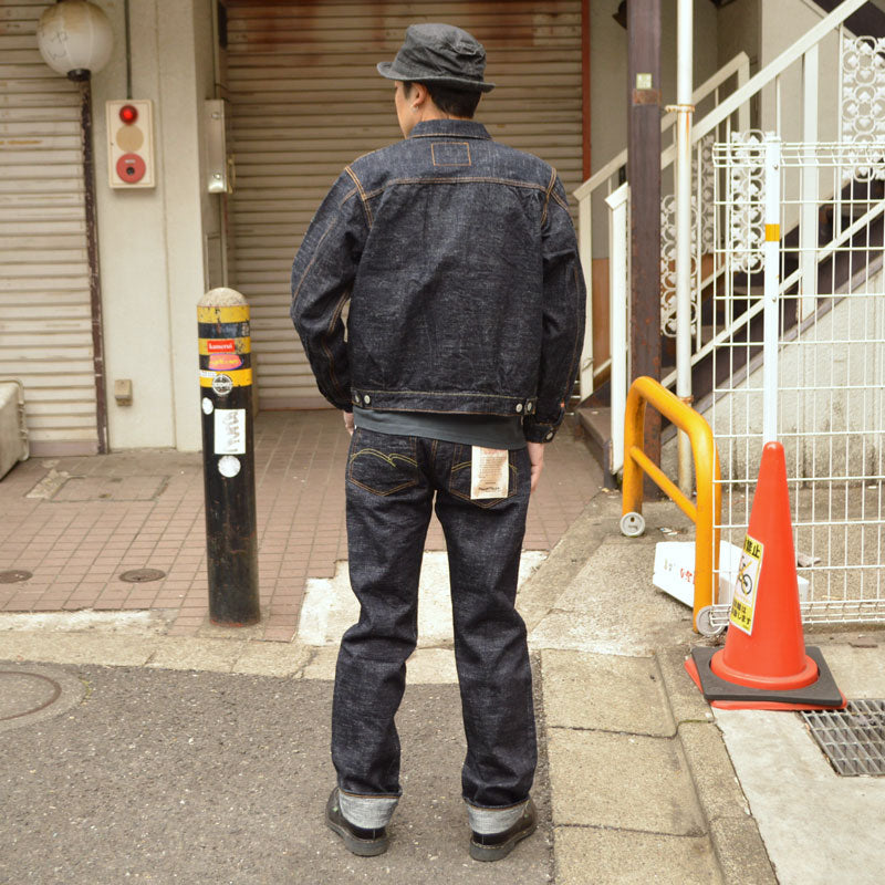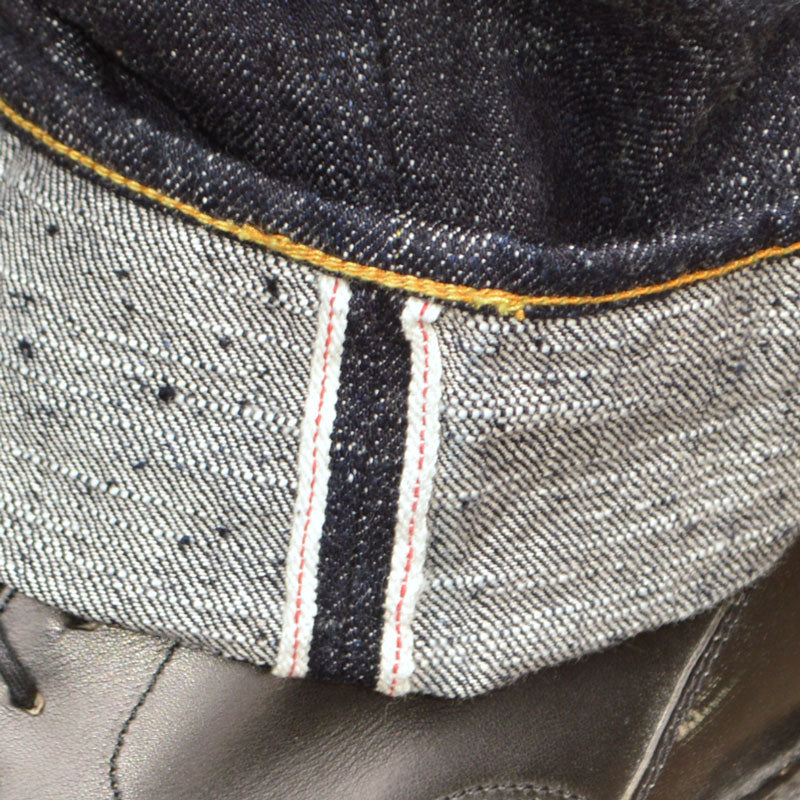 The thick 15-ounce denim fabric woven on a valuable old shuttle loom is characterized by its firm fit and dark dyed color.
