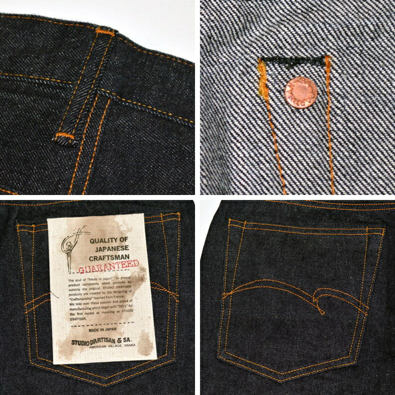 STUDIO D'ARTISAN, which means "artisan's workshop", is a brand from Osaka that has released various items since its debut in 1979. It is the original manufacturer of replica jeans, and is so particular that it divides its products into "natural indigo denim", which has a heavy color fade even among natural indigo dyes, and "pure indigo denim", which has clear shades.