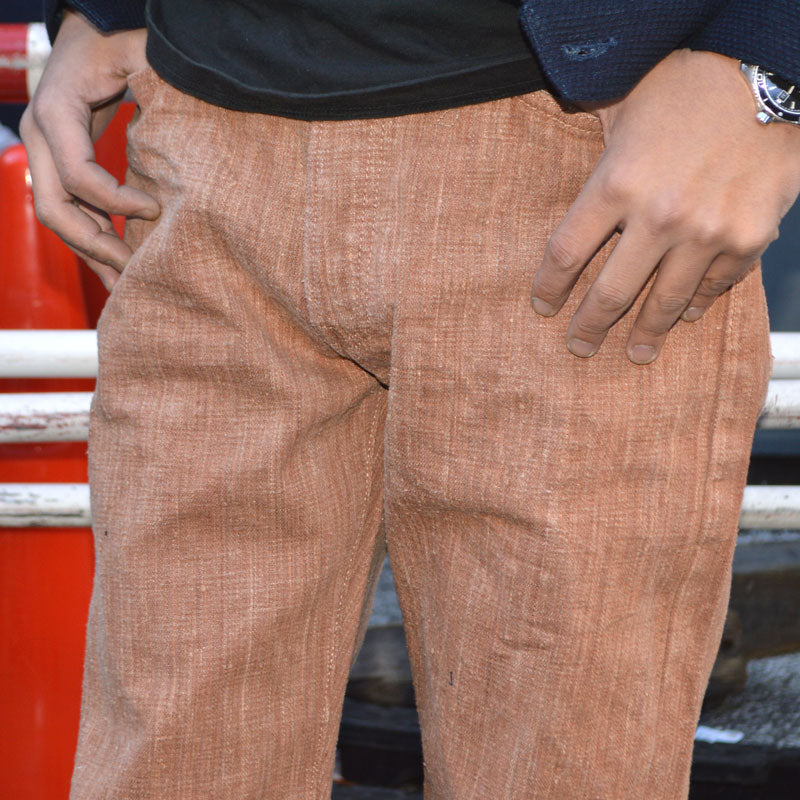 The warp threads, dyed with the traditional Japanese dyeing technique "persimmon tannin dyeing", are exquisitely harmonized with No. 6 slub yarn and nep yarn, and are gradually beaten to the limit during the weaving process on a power loom, creating a strong unevenness.
