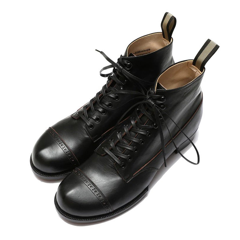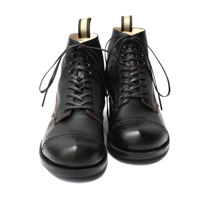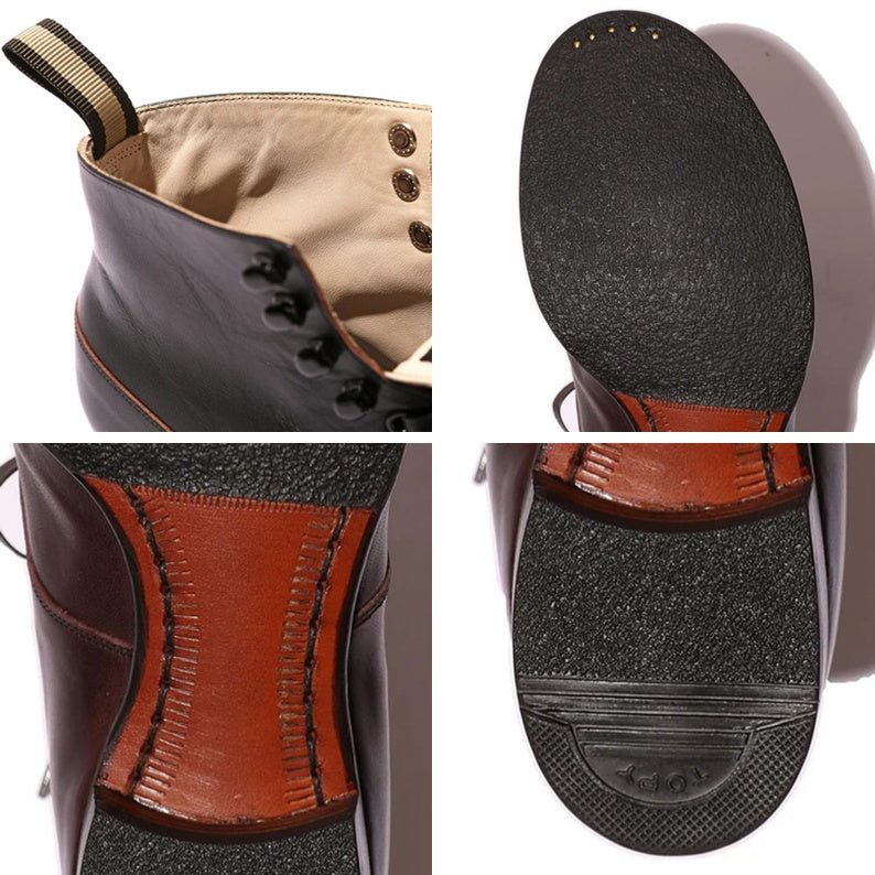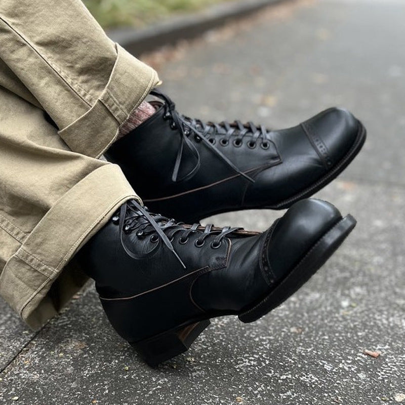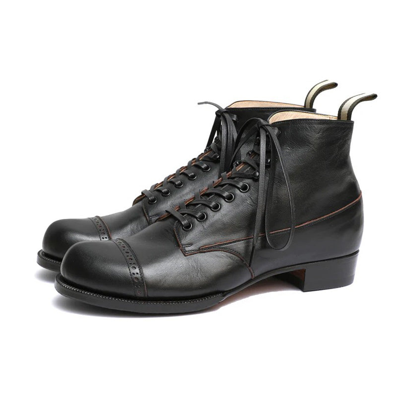 They were inspired by American and French boots from around 1910. These capped-toe boots feature a high toe (sometimes called a high-toe or bulldog-toe) and a waistband made of separate pieces sewn together above and below.