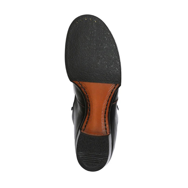 An original, slightly oblique toe last is combined with a small cap, large waistband, low height, and small heel to create the look and feel of boots from that era.