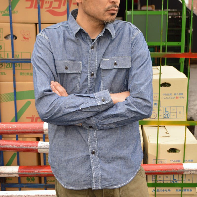 This shirt is a reproduction of a vintage chambray shirt. The 6oz fabric has a high density of warp and weft threads, giving it a paper-like, firm feel. The slightly oversized chest pocket and triple-stitched seams give it a vintage feel. The buttons are durable urea buttons with a striped cat's eye pattern.