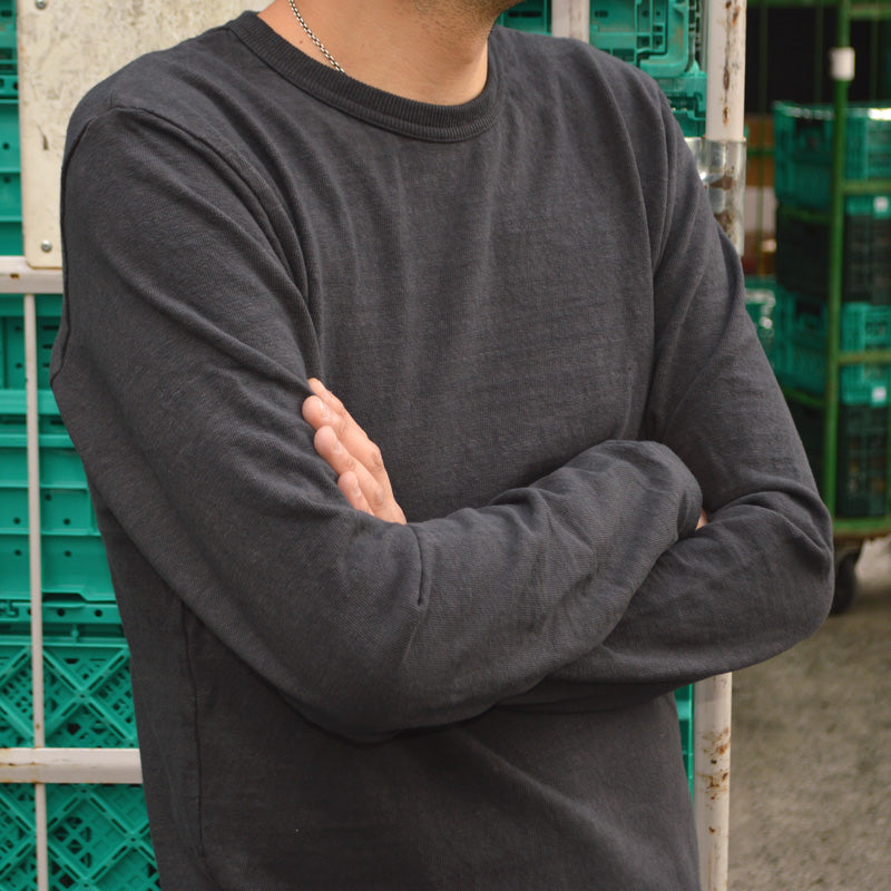 This is a UES No. 8 slub nep long-sleeved T-shirt. Considering the thickness of the No. 8 thread, this shirt is twice as thick as UES's standard desi cotton & organic jersey, making it extremely durable and with a unique texture. The fabric is 9.5oz. In addition to the unique slub shape, it is also very rich in nep. This fabric is hard to find elsewhere, and while it has a strong presence, it softens once you put it on and is very comfortable to wear.