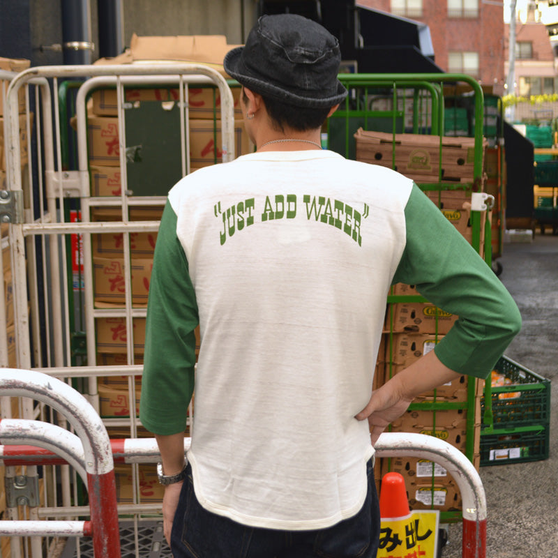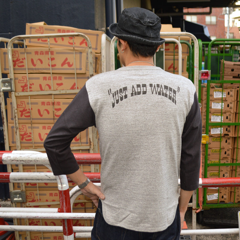 A three-quarter sleeve baseball tee with a switching design on the sleeves.