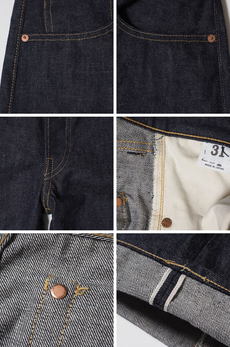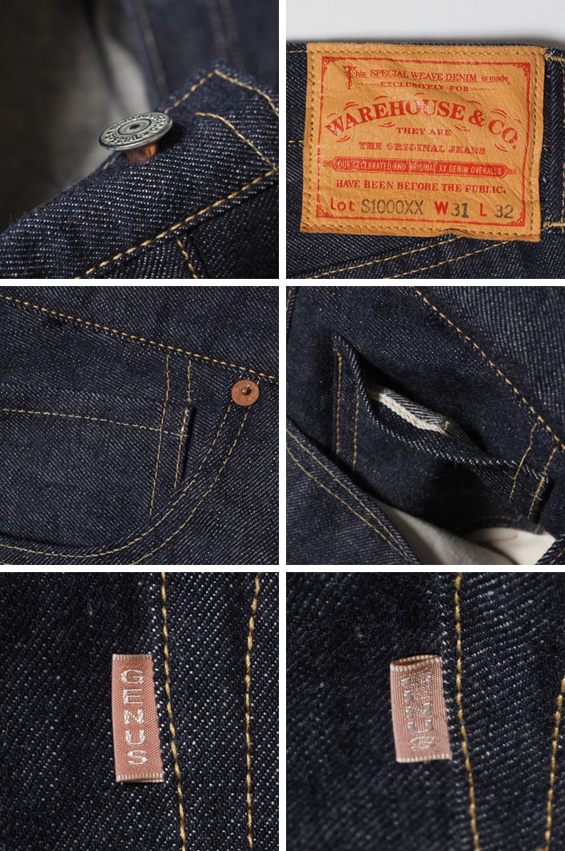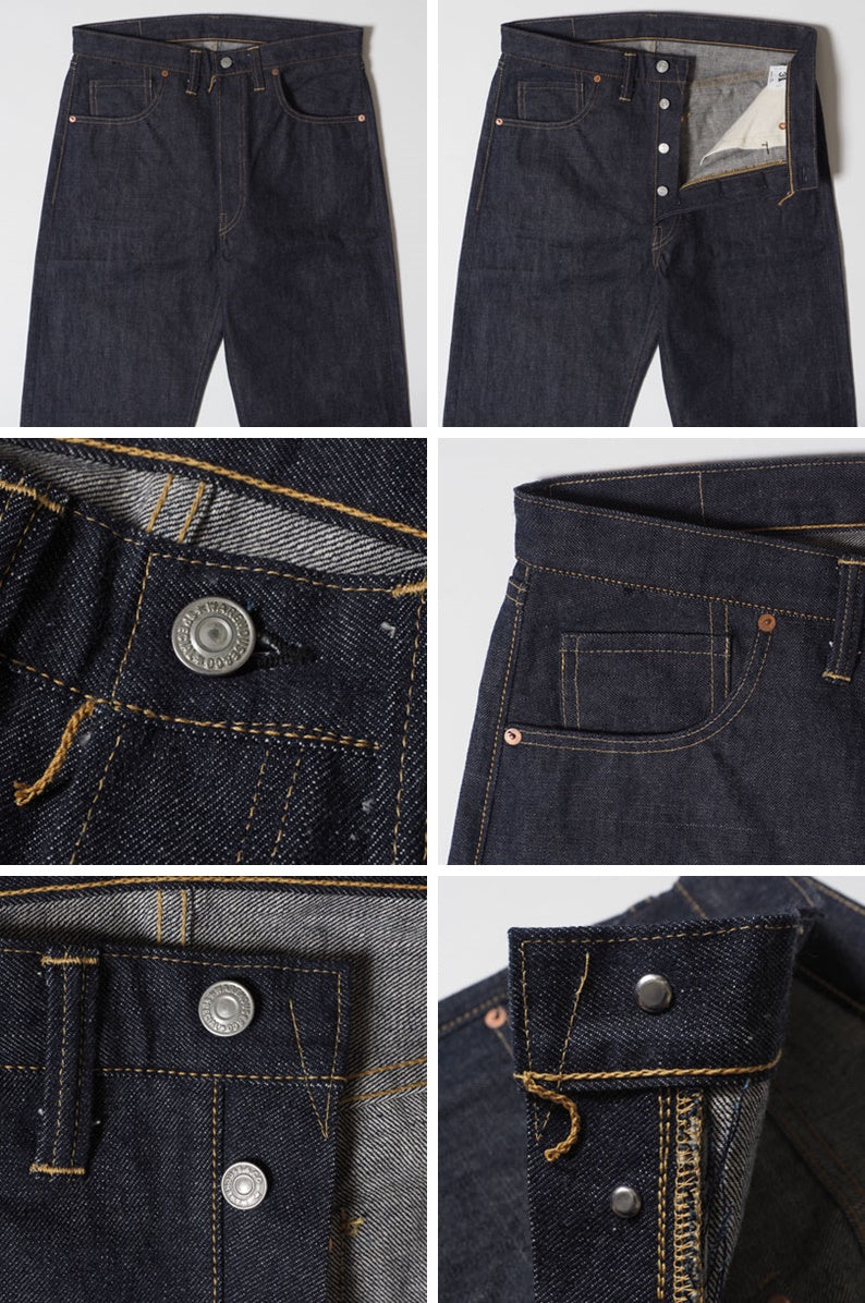 Part number S1000XX, 100% cotton, 6.7 x 6.6, made in Japan, detail leather patch, button fly, cotton thread sewing, selvedge denim