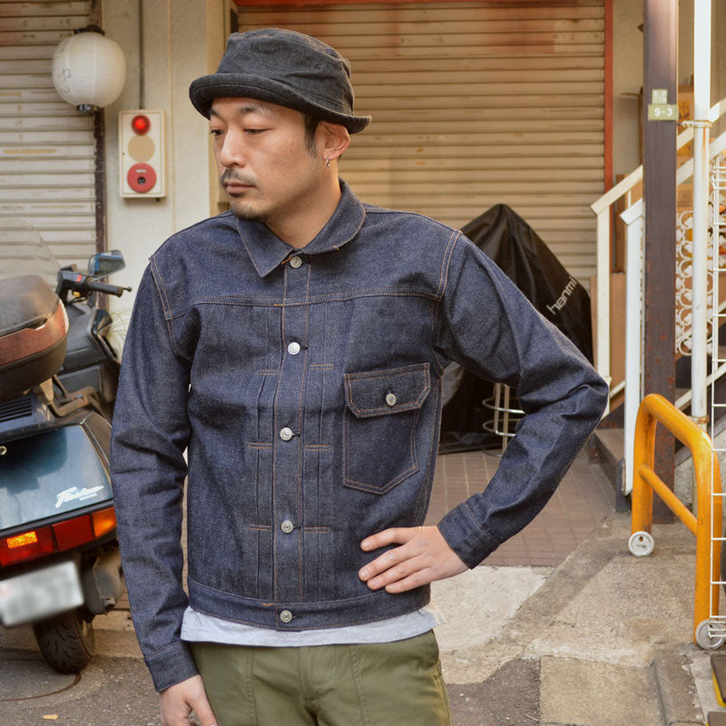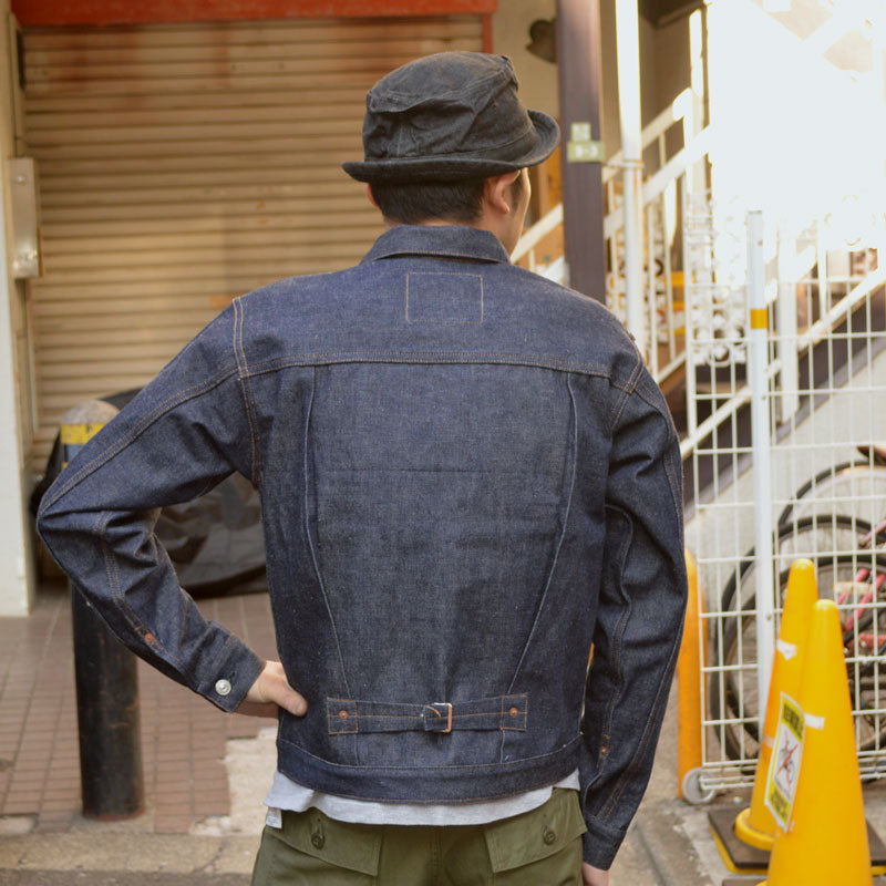 In later years, the collar becomes sharp and the angle changes. The crimson line that goes into the selvedge part of the denim fabric has also been newly developed to reproduce the specifications at that time.