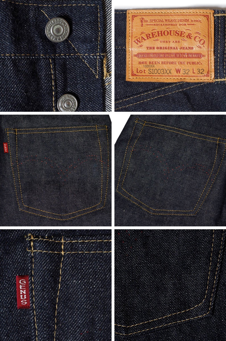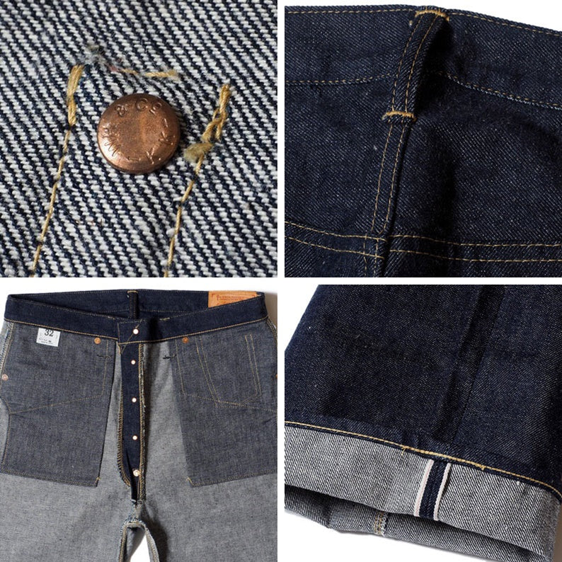 Part number S1003XX, 100% cotton, 6.7 x 6.6, made in Japan, detail leather patch, button fly, cotton thread sewing, selvedge denim