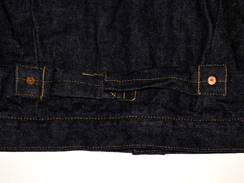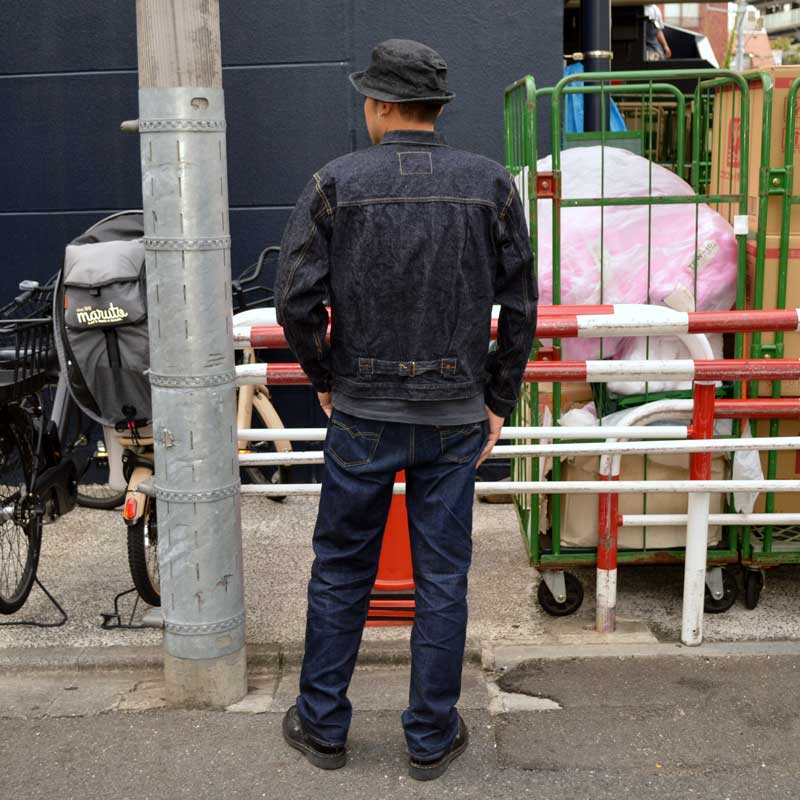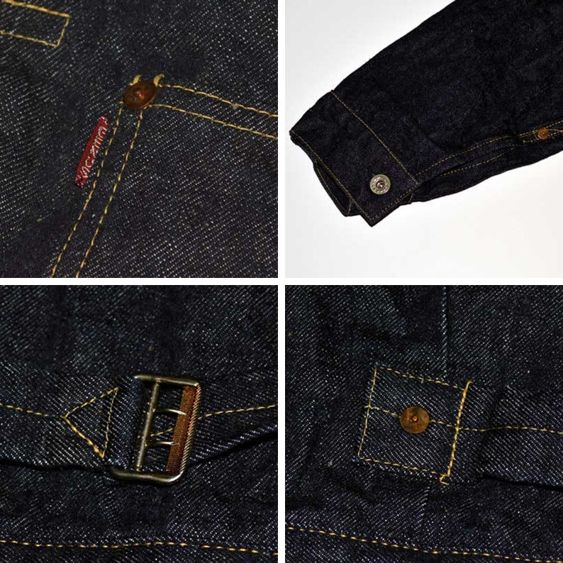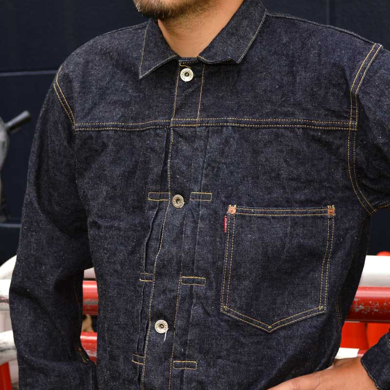 The fabric is a 14-ounce denim fabric that was analyzed from wartime vintage denim and woven with threads of 6.7 length x 6.6 width.