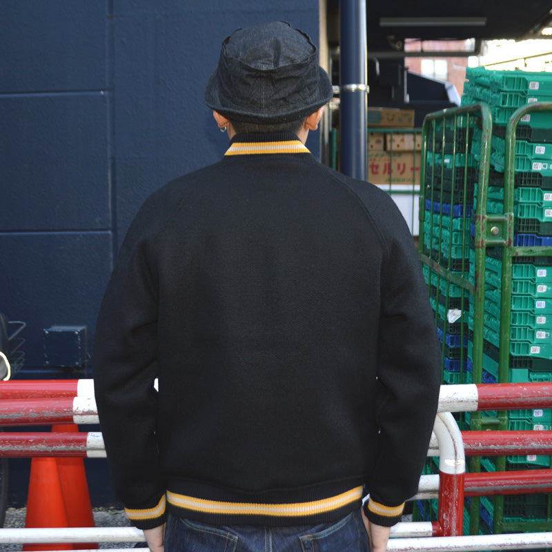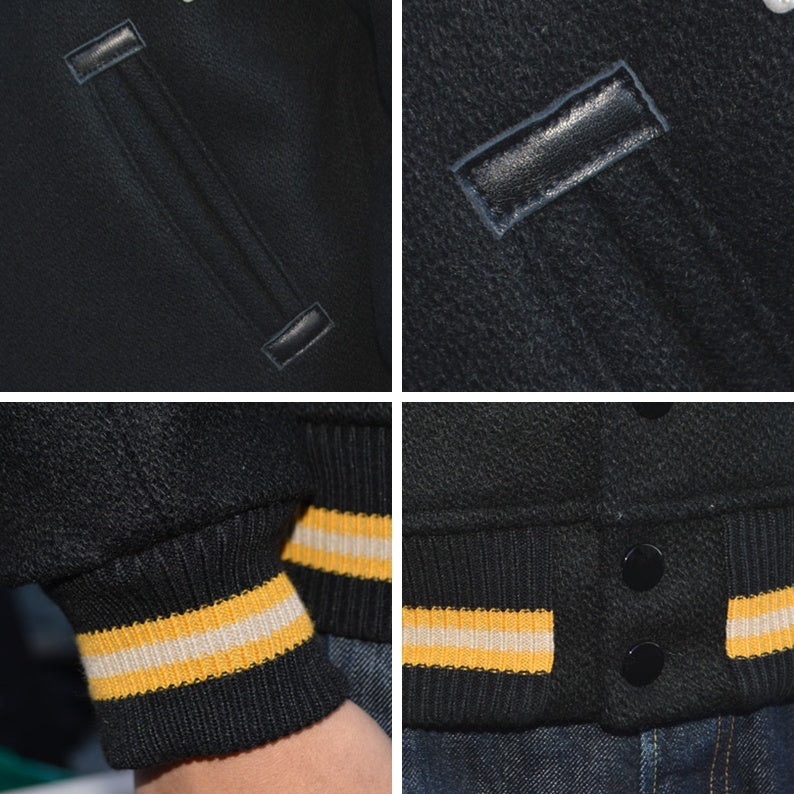 This West Point varsity jacket is made entirely of melton with felt lettering. The body is made of coarse black wool and is lined with rayon and cotton. It features US Army black melton with yellow striped ribbing. A varsity jacket worn by civil service academies that train elites is a highly valued garment in America. For West Point, the US Navy is their arch rival, with whom they have fought deadly battles since the early 20th century, including in football, with the motto "SINK NAVY, BEAT NAVY." The stronger the rivalry between the Army and Navy, who are considered arch rivals despite being from the same country, the more powerful a country must be.