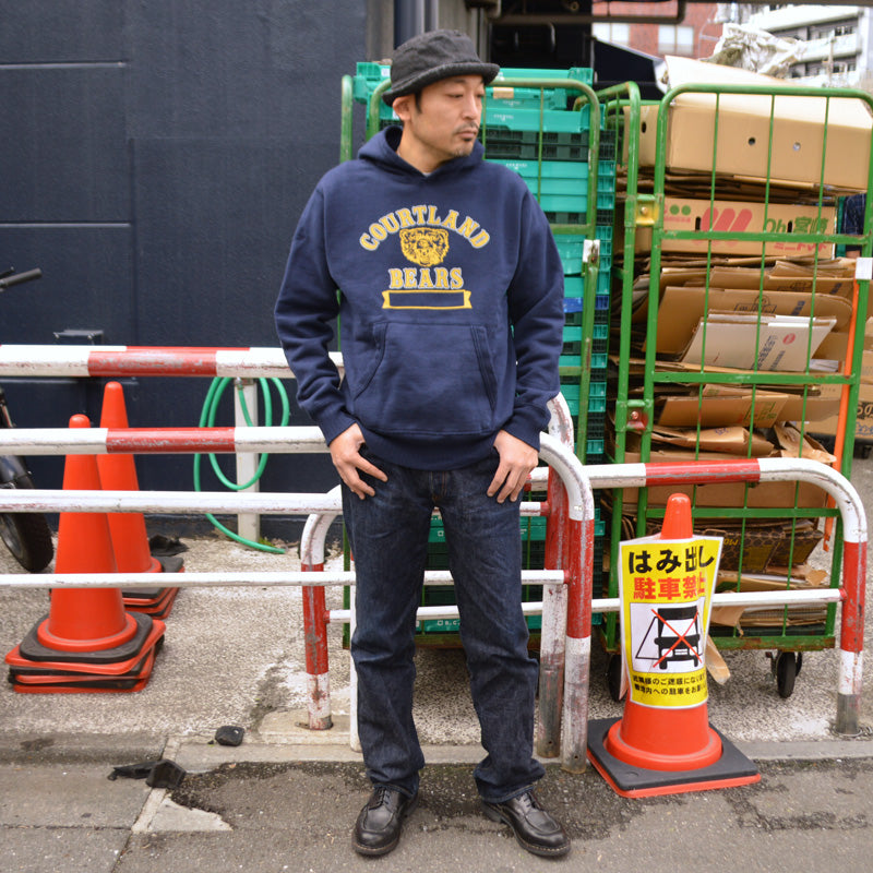 This sweatshirt hoodie is made from heavy fabric and sewn on a flat-seam machine. This sweatshirt faithfully reproduces the characteristics of sportswear from the 1940s and 1950s, down to the finest details such as the material and stitching, and the more you wear it, the more comfortable it becomes. The hood is made from two pieces of fabric glued together, and the kangaroo pocket features a distinctive ribbed piping. The body is round and uses needle-punched ribbing. It has an authentic feel that will last for years, and the thick hoodie makes it great to wear on its own. The design is very Americana casual, so it can easily be worn as an inner layer under outerwear, and it also makes a statement when worn on top, making it a very useful piece.